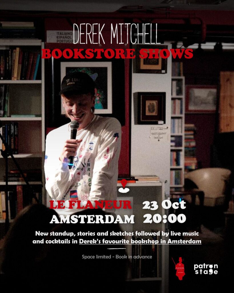 Derek Mitchell: Bookshop Shows New standup, stories and sketches followed by live music and cocktails in Derek’s favourite bookshop in Amsterdam Space limited – book in advance